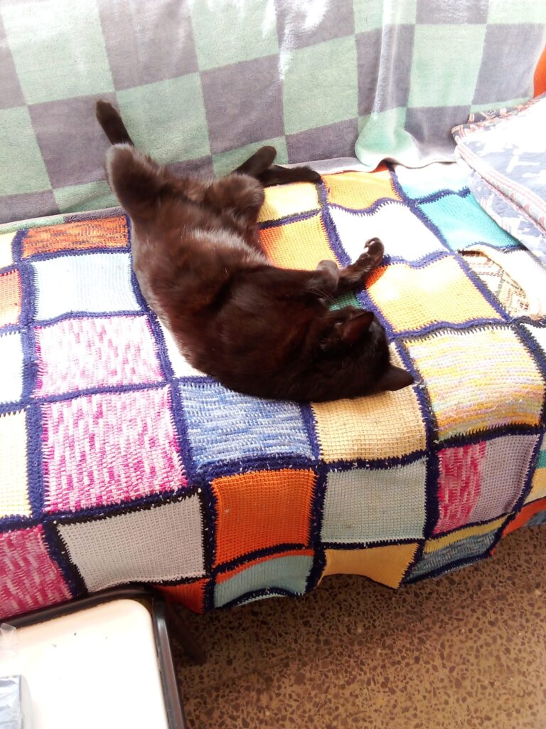 Mein Dickerchen schläft und ich sitze neben ihm und arbeite an meiner Häkeldecke