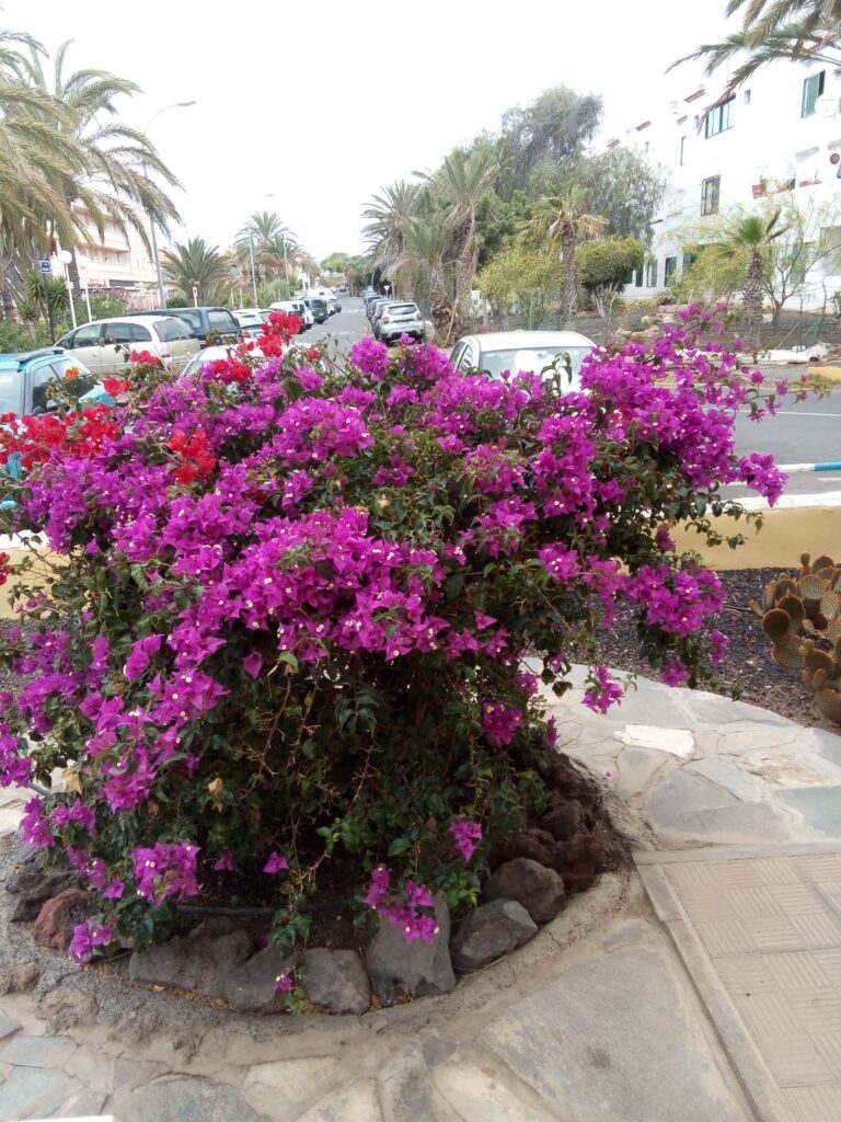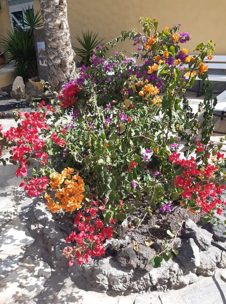 Vor unserem Haus haben wir einen kleinen Vorgarten mit Sitzbänken und einer wunderschön blühenden Bougainvillea
