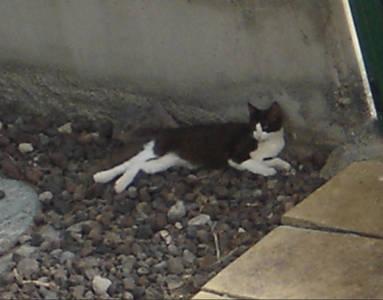 Heute bin ich gleich zweimal hier. Das ist Browney, sie liegt im Vorgarten und wartet wieder auf Futter.